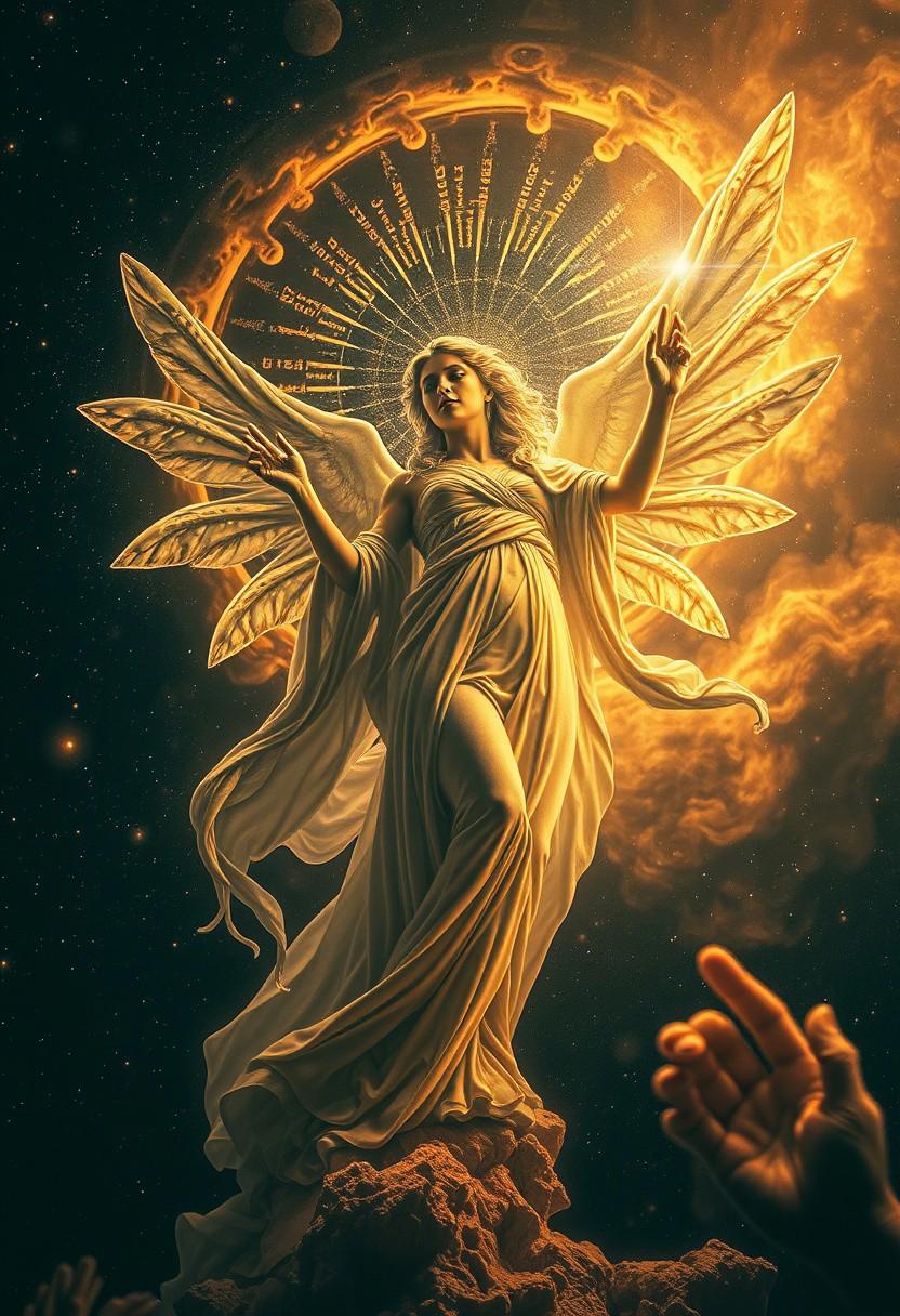 Create a surreal, whimsical scene with a goddess within the cosmos. The figure should be illuminated, blending hyper-realistic details with an ethereal atmosphere. Capture the essence of an epic, cinematic masterpiece, filled with intricate details and a sense of wonder. mezzotint, high contrast, cinemascope, whimsical, majestic, divine art, low angle