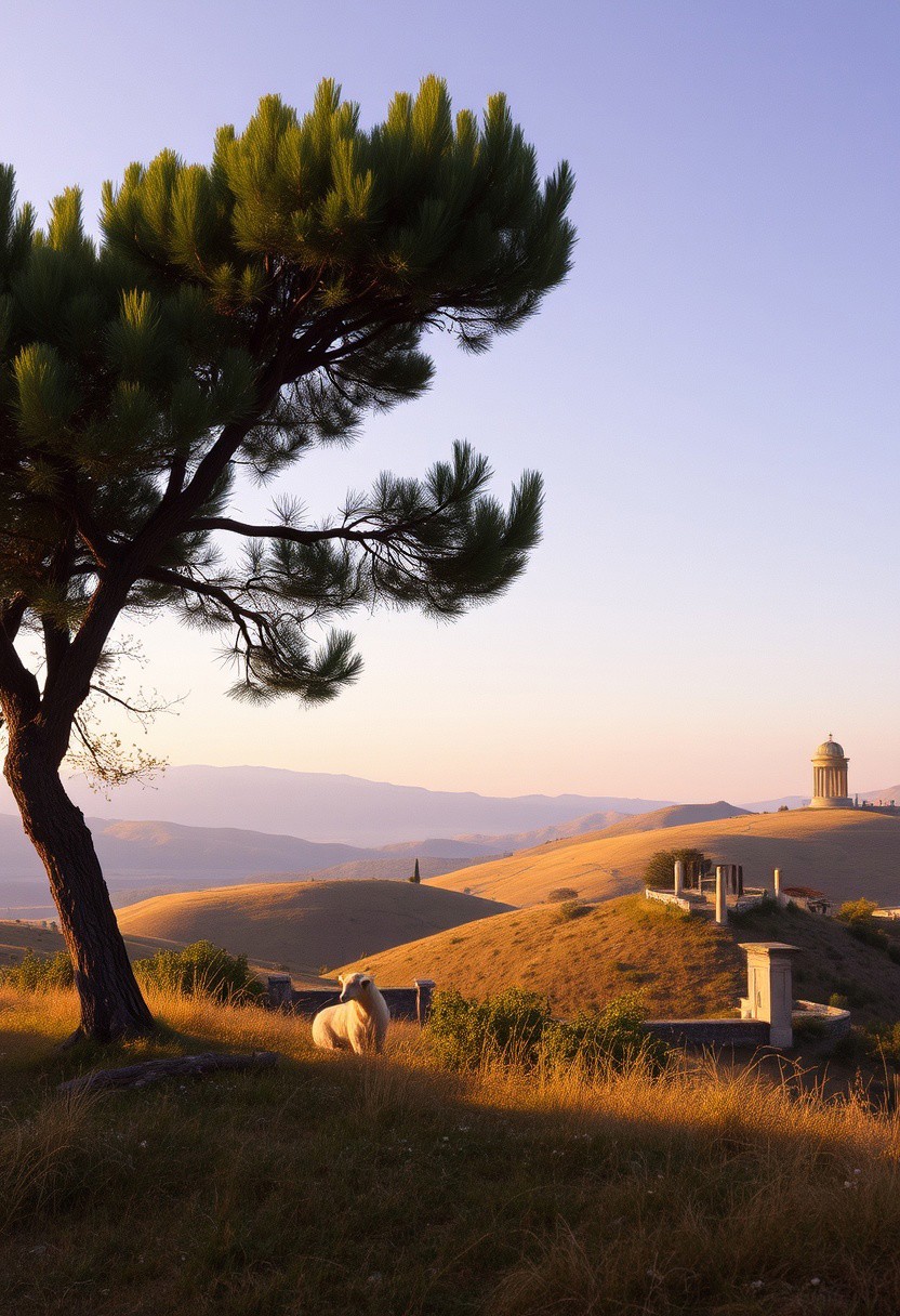 A shepherd resting beneath a cypress tree, overlooking gentle hills under a lavender sky., romanticism, poetic landscape, Italian countryside, soft golden light, classical ruins, serene atmosphere, symbolic natural scenes, melancholic tone, harmonious composition, early evening glow, pastoral serenity, muted colors, spiritual naturalism, pre-Raphaelite influence, idealized nature, 19th century Italian art