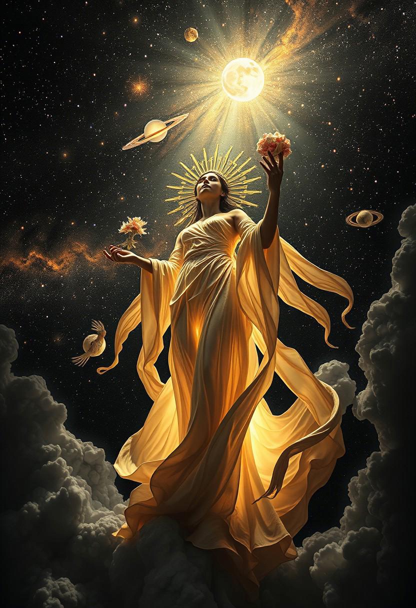 Create a surreal, whimsical scene with a goddess within the cosmos. The figure should be illuminated, blending hyper-realistic details with an ethereal atmosphere. Capture the essence of an epic, cinematic masterpiece, filled with intricate details and a sense of wonder. mezzotint, high contrast, cinemascope, whimsical, majestic, divine art, low angle