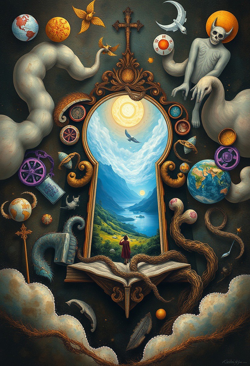 A floating keyhole framed by abstract symbols, revealing a dreamlike world inside., surrealistic style, dreamlike quality, fantasy, reality, mesmerizing composition, whimsical imagery, symbolic motifs