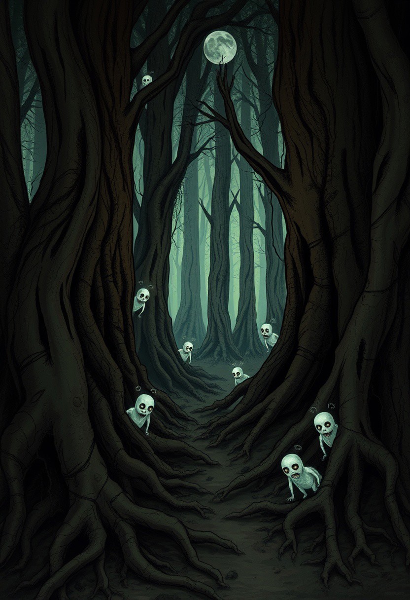 A forest filled with tiny, mischievous spirits, playing hide-and-seek among the roots of ancient trees digital, creepy ghostly figure, eerie and unsettling presence, a fusion of dark fantasy and chilling horror elements. The artwork delves into themes of the macabre, the supernatural, and the uncanny, using a stark color palette, expressive lines, and intricate details to evoke a sense of foreboding and intrigue.