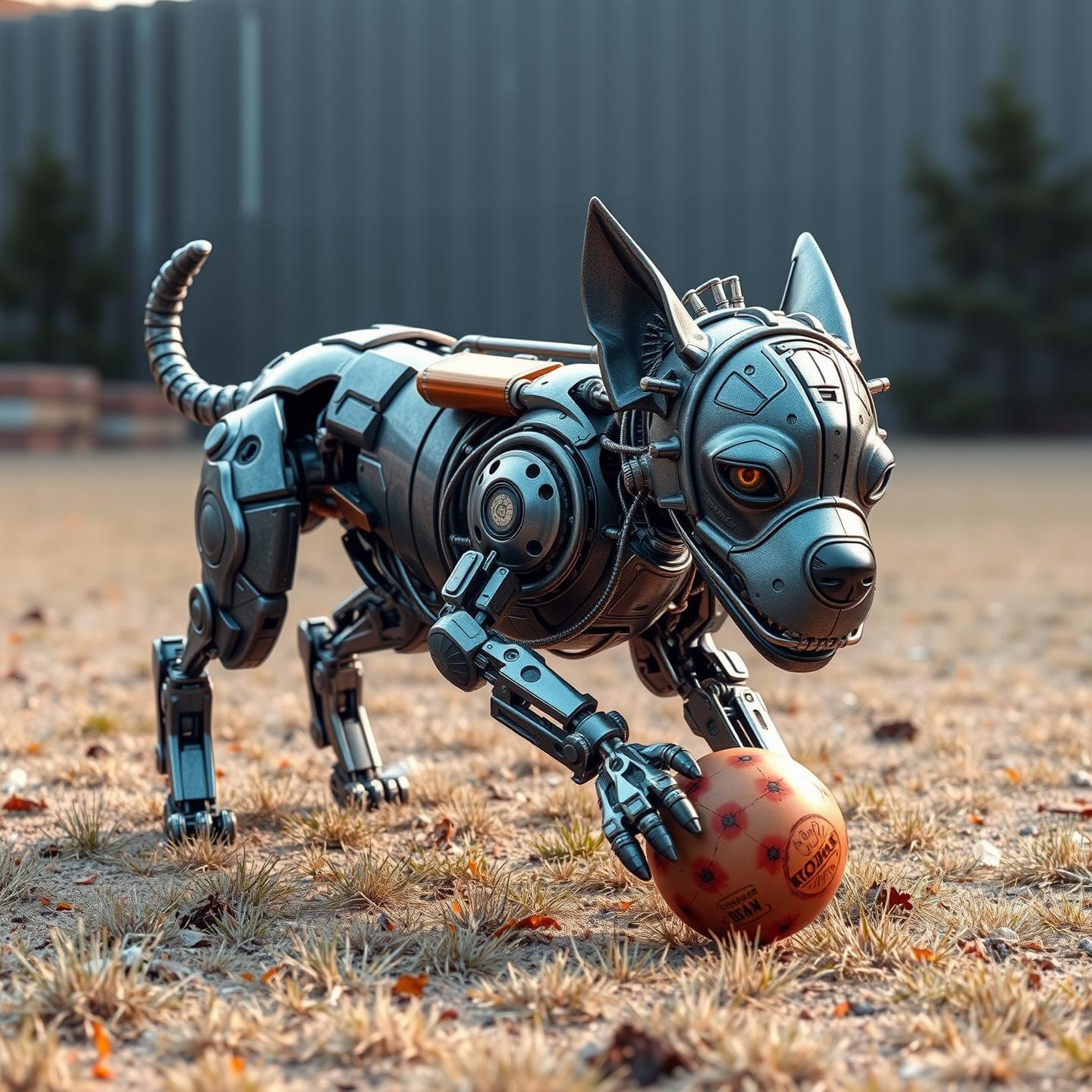 A hyper-realistic cyborg dog with an arc reactor brain plays in a yard, showcasing intricate biomechanical details.