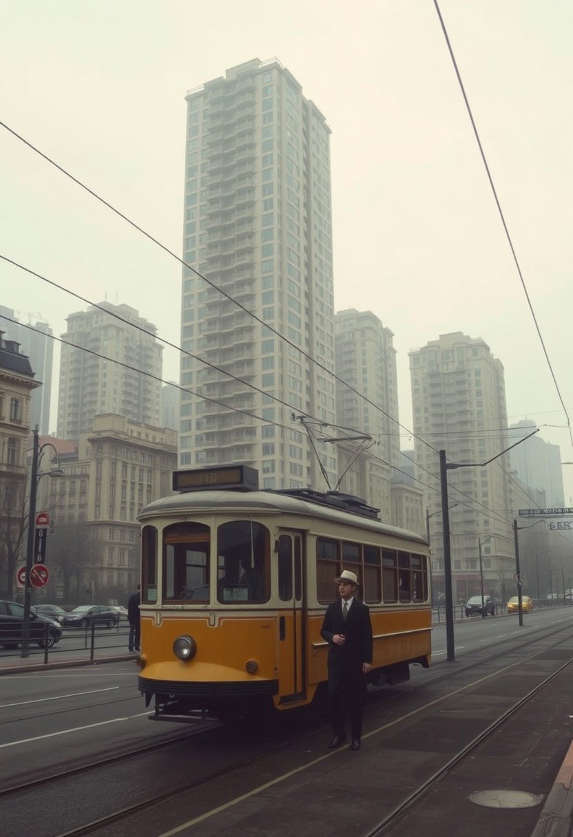 surreal cityscape, vintage tram, tall apartment buildings, muted colors, overcast sky, early 20th-century clothing, contemplative mood, isolation, urban setting, dreamlike atmosphere, minimalist architecture, lone pedestrian, nostalgic style