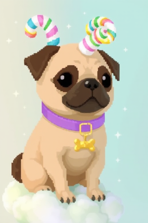 A pixel art pug with fluffy caramel fur and chocolate-drop eyes, wearing a lavender velvet collar with a golden bone pendant, sits upright on a mint-green cloud. A spiraled cotton-candy horn topped with rainbow jimmies erupts from its head, dripping sugary glaze. Soft pastel lighting creates a dreamy, confectionery glow, while tiny gumdrop stars float in the background. Style: Hyper-detailed 3D render with glossy textures and candy-shell iridescence. _________ dramatic beauty, otherworldly quality, soft lighting, shallow depth of field, high detail, dynamic composition, cinematic shot, film grain, balanced shadows, harmonic colors, emotional depth, symbolic meaning, innovative props/costumes, timeless elegance, modern themes, iconic imagery, unforgettable moment, captivating beauty, stunning impact, thought-provoking, artistic vision, masterful execution. Pixel art style, clear drawn in big pixels very well aligned, rich showcase, award-winning craftsmanship. UHD resolution enhances the dynamic, impactful pose for a striking, lifelike result.