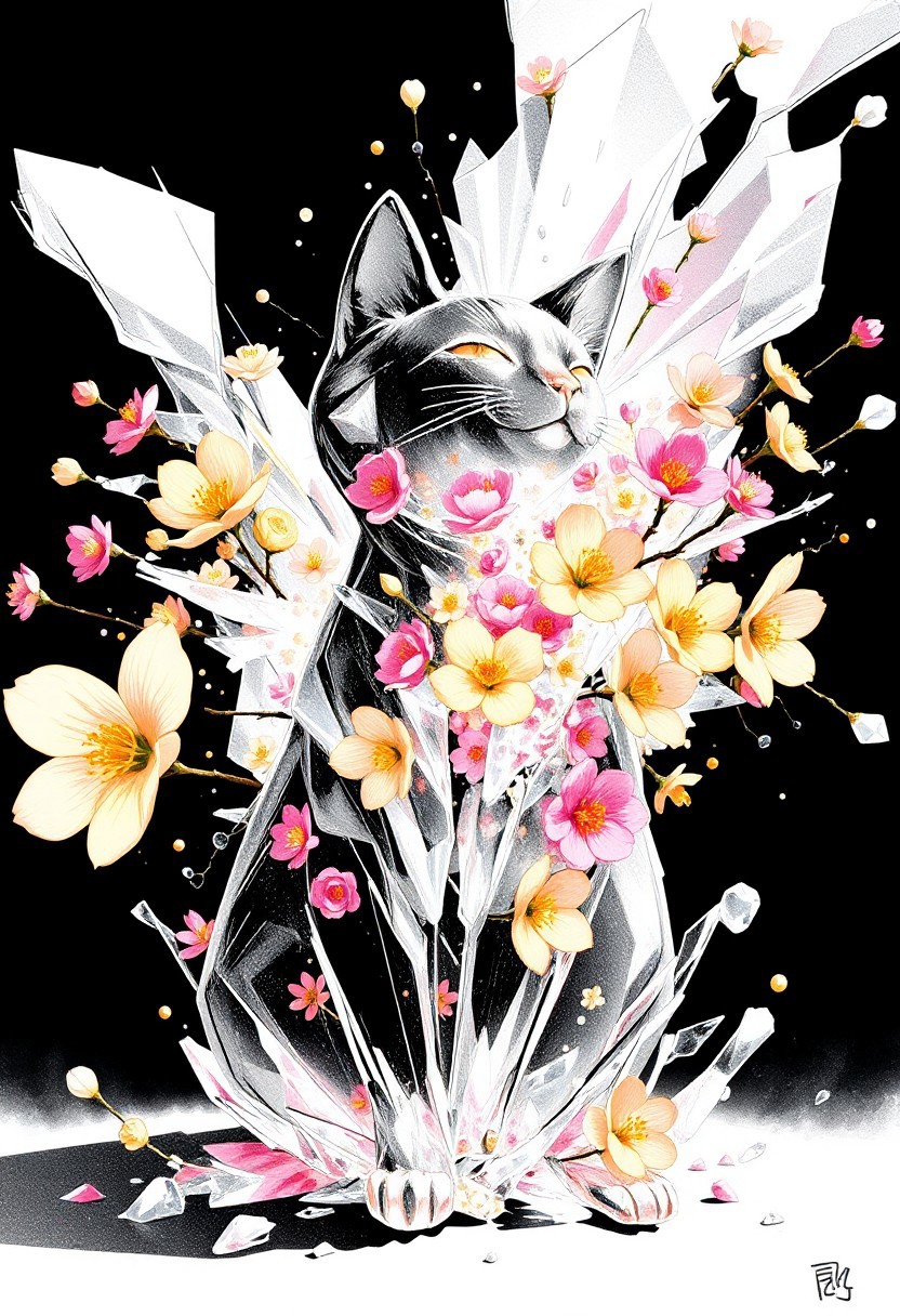 bmstyle anime "A cat made of translucent, crystallized material shatters outward, with shards transforming into a burst of vibrant Sakura flowers. The flowers are varied in color and species, blooming mid-air as if born from the explosion. Soft light refracts through the crystal fragments, creating a surreal, dreamlike atmosphere." <lora:FLUX-daubrez-DB4RZ-v2:0.35> DB4RZ, DB4RZ style painting <lora:illustration004:0.8> illustration004 chaotic expressive line-art scribbled and erratic strokes monochromatic black ink <lora:Scribble Portrait Drawing:0.35> Drawing <lora:aidmaMJ6.1_v0.5_3:0.35> aidmamj6.1, aidmamj6, mystcorbCE_style