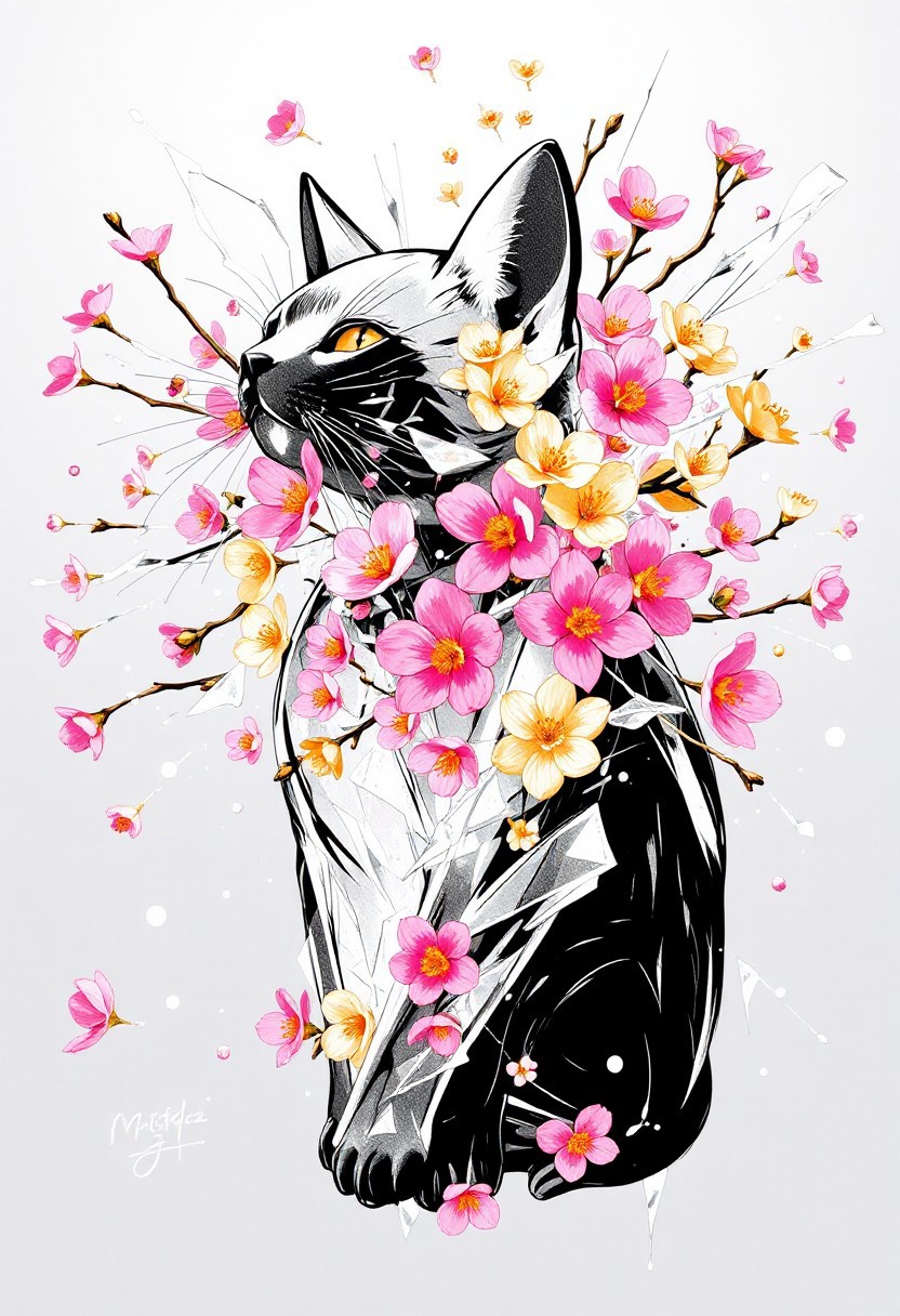 bmstyle anime "A cat made of translucent, crystallized material shatters outward, with shards transforming into a burst of vibrant Sakura flowers. The flowers are varied in color and species, blooming mid-air as if born from the explosion. Soft light refracts through the crystal fragments, creating a surreal, dreamlike atmosphere." <lora:FLUX-daubrez-DB4RZ-v2:0.35> DB4RZ, DB4RZ style painting <lora:illustration004:0.8> illustration004 chaotic expressive line-art scribbled and erratic strokes monochromatic black ink <lora:Scribble Portrait Drawing:0.35> Drawing <lora:aidmaMJ6.1_v0.5_3:0.35> aidmamj6.1, aidmamj6, mystcorbCE_style