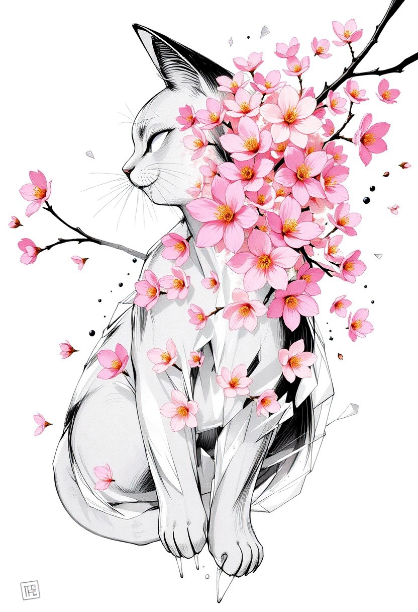 bmstyle anime "A cat made of translucent, crystallized material shatters outward, with shards transforming into a burst of vibrant Sakura flowers. The flowers are varied in color and species, blooming mid-air as if born from the explosion. Soft light refracts through the crystal fragments, creating a surreal, dreamlike atmosphere." <lora:FLUX-daubrez-DB4RZ-v2:0.35> DB4RZ, DB4RZ style painting <lora:illustration004:0.8> illustration004 chaotic expressive line-art scribbled and erratic strokes monochromatic black ink <lora:Scribble Portrait Drawing:0.35> Drawing <lora:aidmaMJ6.1_v0.5_3:0.35> aidmamj6.1, aidmamj6, mystcorbCE_style