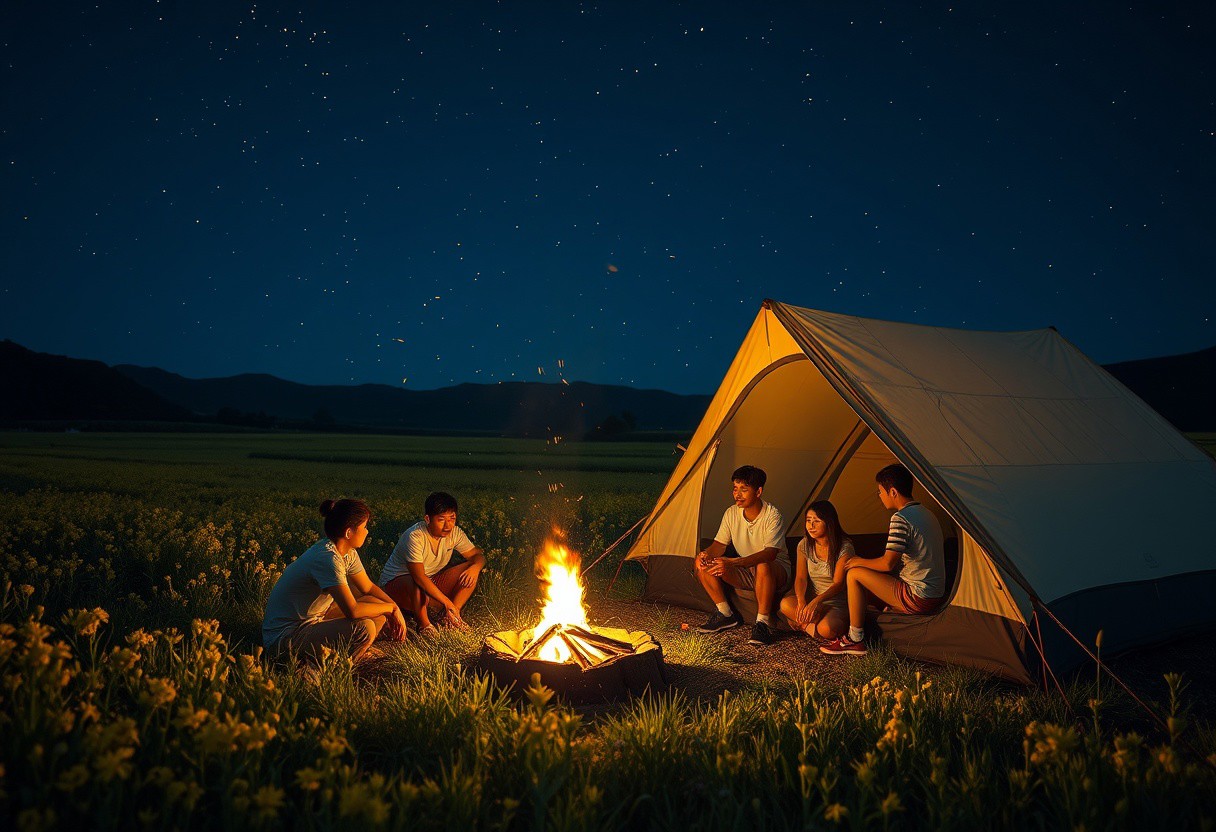 Several young Taiwanese men and women camped on a summer night in a campsite next to a vast sea of rapeseed flowers. They gathered outside a large tent and chatted around the campfire, with many fireflies flying in the night sky. FHD, Rich in details, masterpiece.