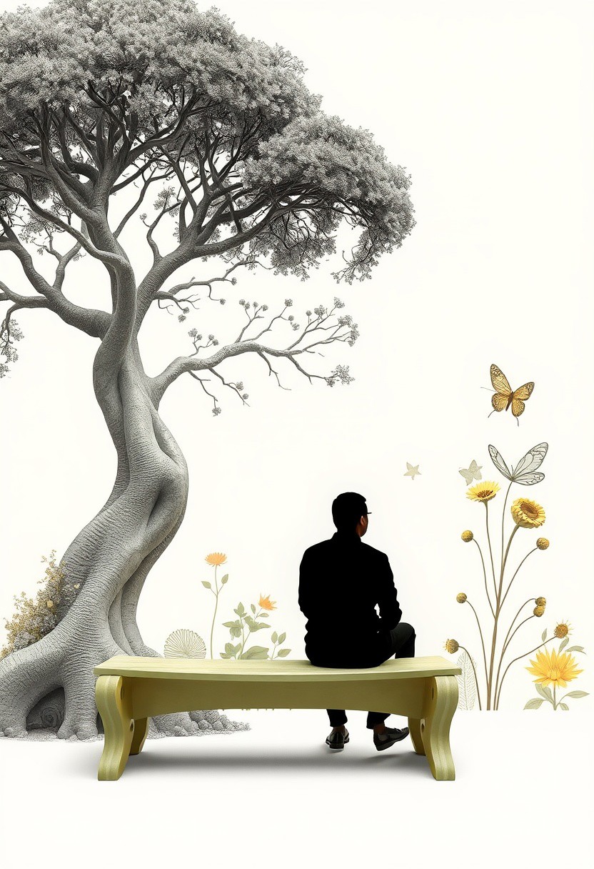 A figure in profile sits on a faded green bench beneath a tree rendered in gentle planes of yellow and grey, sculptural architecture meets botanical illustration, organic structural design with naturalist detailing, biomorphic forms inspired by insects and plants, intricate surface textures, nature-driven engineering, architectural storytelling through metamorphosis, vivid scientific aesthetics merged with contemporary form, kinetic elements reflecting biological cycles, delicate linework fused with bold materials, ecological symbolism, fluid geometry with entomological motifs, garden-inspired public spaces, human interaction with illustrated natural systems, architectural sculpture infused with botanical precision