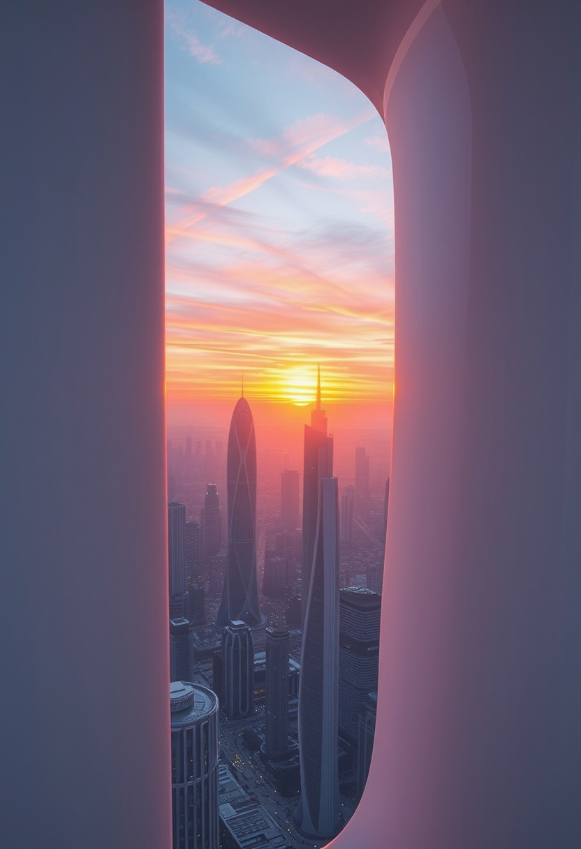 A fleeting sunrise seen through a narrow, frosted slit in the glossy, stark-white composite wall of an ultra-futuristic, dystopian megatower. For a single second, the sun’s radiant, pearlescent-orange rays stream in, casting an otherworldly glow across the pristine, all-white interior filled with pulsating quantum displays, sleek levitating panels, and softly whirring tech nodes. Beyond the slit, a sprawling, hyper-advanced cityscape stretches out with towering, elegantly curved skyscrapers—their smooth, flowing designs resembling liquid glass—and glowing energy grids, all silhouetted against a sky streaked with iridescent pink and lavender hues. The brief sunlight reflects off the polished white surfaces inside, amplifying the contrast between the sterile, high-tech environment and the ephemeral beauty of the sunrise, before shadows return.