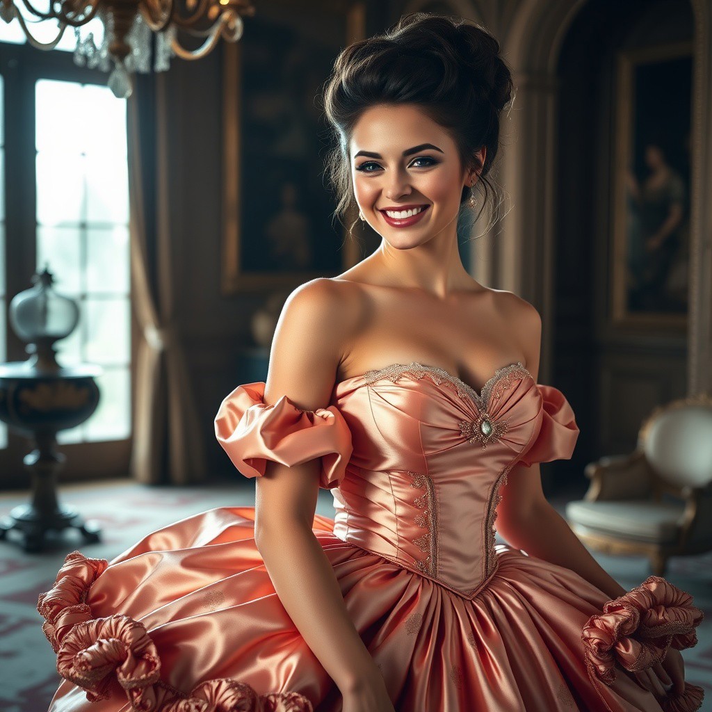 realistic photo, beautiful lighting, , beautiful english woman, updo hair, wearing shiny satin ornate victorian hoop dress, in ballroom of mansion, smiling, happy, hoopdress