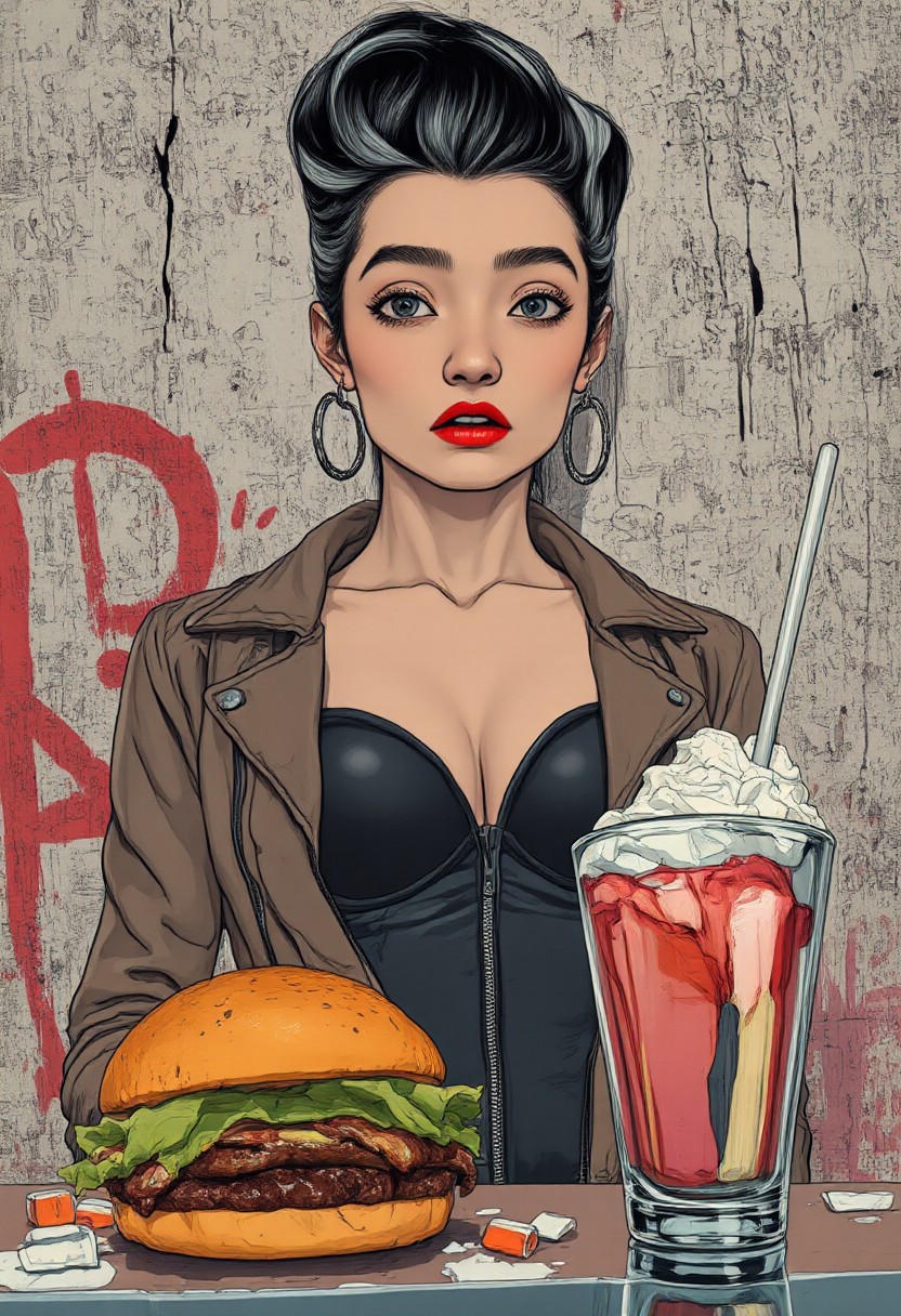 JBX_Rockabilly_Retro. Surreal anime illustration of a young glamorous cool Rockabilly-style woman with dramatic pompadour bouffant hair, large bust, black latex bullet bra, open leather biker jacket and heavy makeup. She stands against a textured background with graffiti. A thick beef and bacon burger and a coloured milkshake with whipped cream and marshmallow topping.