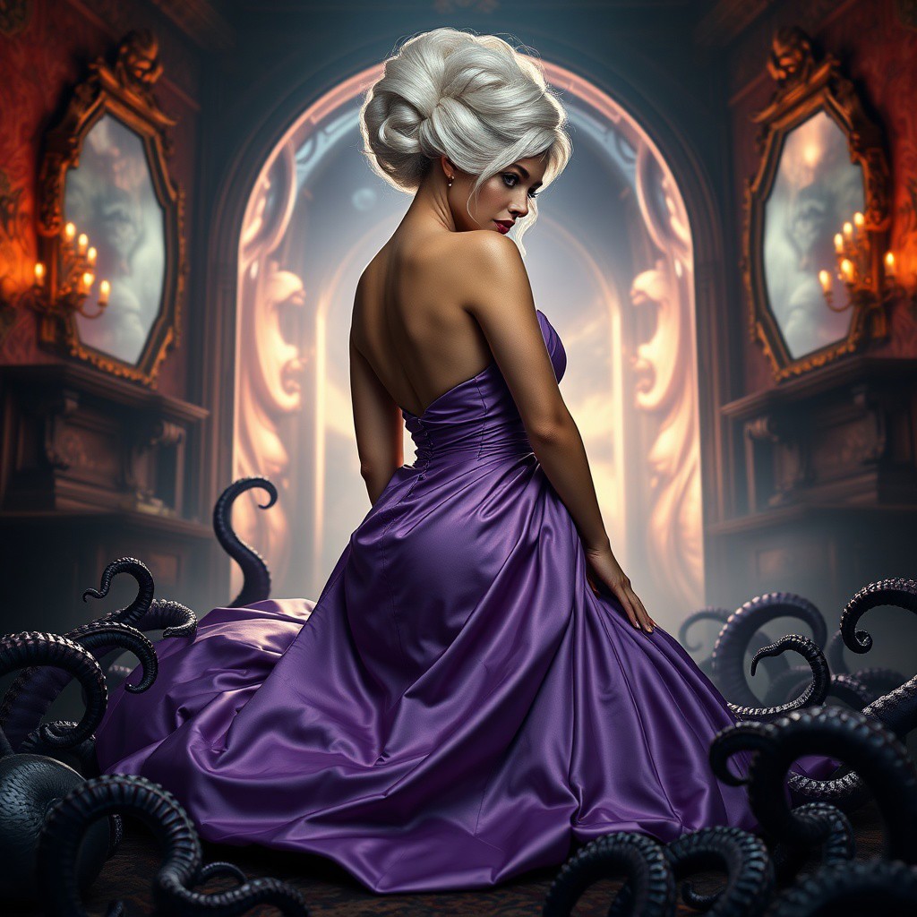 Sexy, sultry, (Female, 1girl):1.3, (satin highly detailed georgian gown):1.3, (Huge breasts, big boobs, Large breasts), (firm Round perky breasts:1.2), (posturecollar):1.25, (, slim waist:1.35). Hair in large updo. kneeling at gianty purple jelly pillow, surrounded by slimy tentacles, lifted skirt, high heels, fog, horror, giant portal to space at background, mirrors Rembrandt Lighting Style, great lighting. At twilight, in victorian mansion sideview Ultra realistic, 8k, uhd, best quality, best resolution, lifelike, white wig, ent over, on all fours, large breasts, big boobs, huge tits, georgian gown,