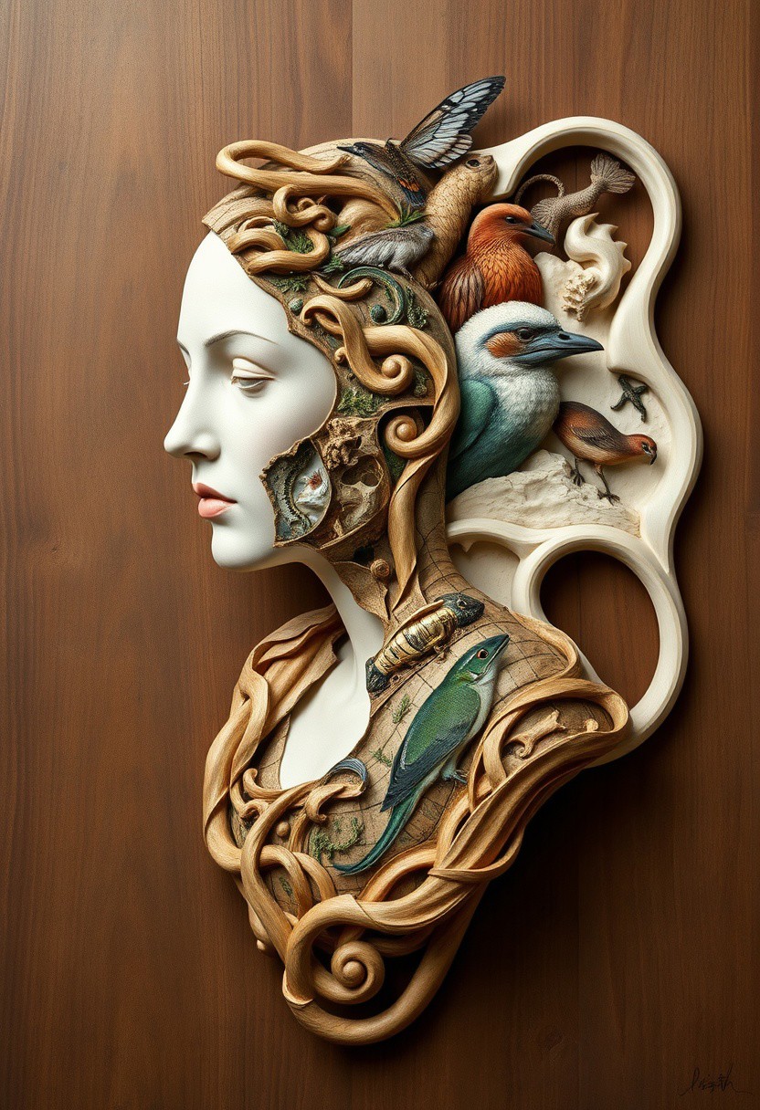 A fragmented bust of a noblewoman, naturalistic surrealism meets abstract sculptural form, detailed wildlife illustration integrated with biomorphic abstraction, fluid organic structures supporting precise animal forms, surreal ecosystems emerging from curvilinear shapes, acrylic on raw wood fused with sculptural rhythm, ecological symbolism through twisted forms, anatomical precision set within flowing, looped geometry, earthy muted palette with sculptural contrast, dreamlike nature fused with material exploration, poetic biology interacting with conceptual structure, transformation and interconnection in three-dimensional visual language, meditative surrealism with tactile abstraction