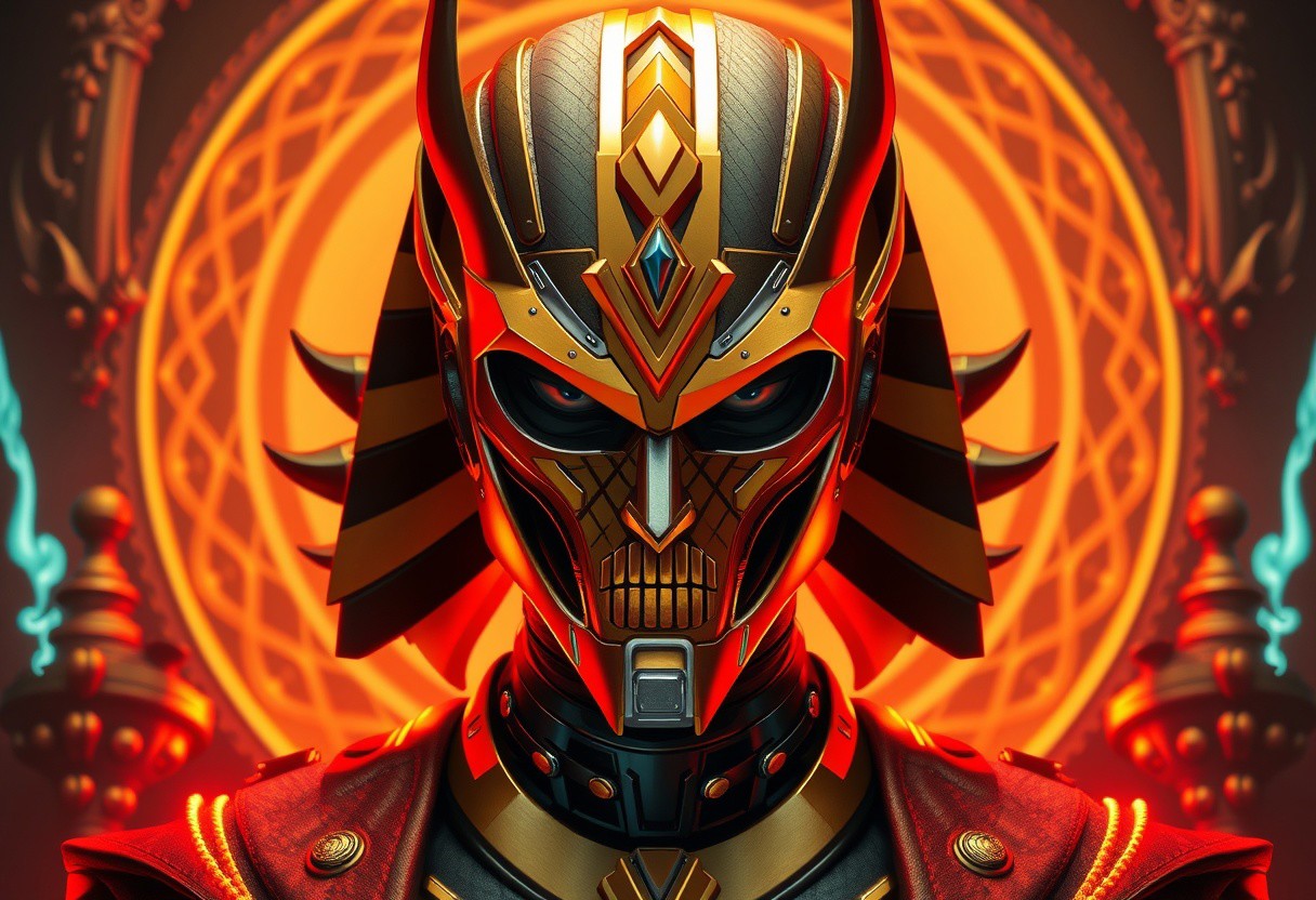 Create a high-resolution, cinematic image of Elemental HERO Bladedge merged with Curse of the Masked Beast, inspired by storm Egyptian gods and 1970s X-Men art style. The character, named Chad, should be depicted with epic bionic cyborg implants, set against a rich, deep, symmetrical Neo-Gothic background. Incorporate Fibonacci elements and micro details, with a focus on lifelike, photorealistic quality. The image should evoke a sense of luxury and have a vibrant, high-contrast color scheme. The final image should be in 8K resolution, with a 16:9 aspect ratio, and be suitable for use as a film still or diorama. Incorporate the style of Ayami Kojima, Amano, and Ilya Kuvshinov, with a focus on cohesive, atmospheric lighting.