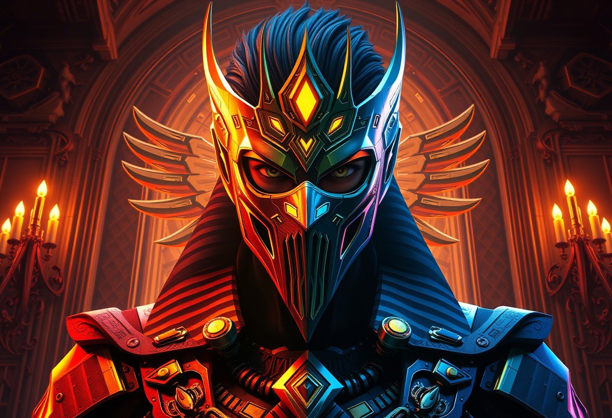 Create a high-resolution, cinematic image of Elemental HERO Bladedge merged with Curse of the Masked Beast, inspired by storm Egyptian gods and 1970s X-Men art style. The character, named Chad, should be depicted with epic bionic cyborg implants, set against a rich, deep, symmetrical Neo-Gothic background. Incorporate Fibonacci elements and micro details, with a focus on lifelike, photorealistic quality. The image should evoke a sense of luxury and have a vibrant, high-contrast color scheme. The final image should be in 8K resolution, with a 16:9 aspect ratio, and be suitable for use as a film still or diorama. Incorporate the style of Ayami Kojima, Amano, and Ilya Kuvshinov, with a focus on cohesive, atmospheric lighting.