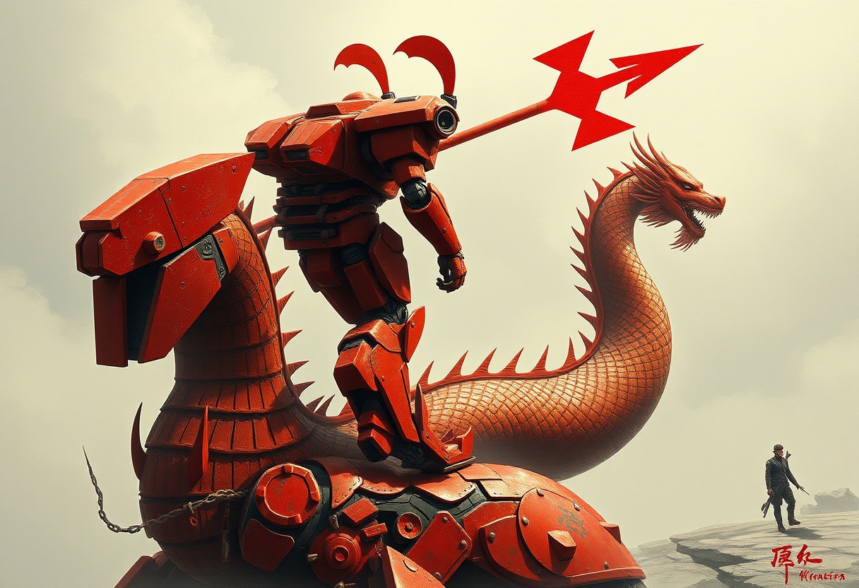 Create a highly detailed, hyper-realistic painting of a full-body red mech standing on a Dragon Treasure, with a man walking in the background. The mech should be designed with correct proportions and have a Spartan aesthetic. Incorporate a curved red arrow and a flat, Raku-inspired painting effect. The style should be reminiscent of Cam Sykes and Kentaro Miura. The image should be in 8K high resolution, with sharp focus and micro-details. The overall mood should be dramatic and surreal. Include front and back views of the mech. The art piece should be of high quality, trending on Artstation, and suitable for a beginner artist.