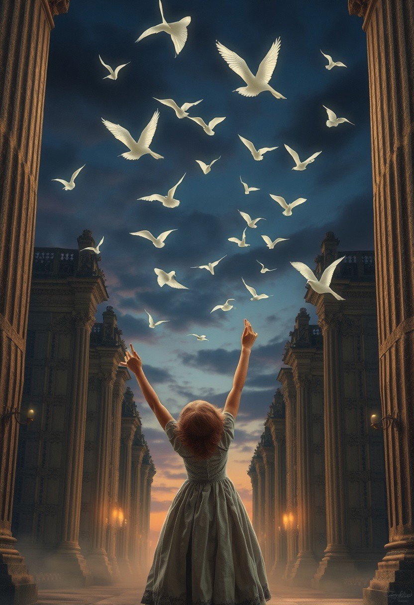 A young girl in Victorian attire releases paper birds into a sky filled with colossal ruins, bathed in twilight and divine light., ethereal female figures, antique fashion, soft muted colors, symbolic imagery, classical architecture, glowing light, baroque interiors, dreamlike atmosphere, mystical realism, intricate detailing, sacred geometry, allegorical storytelling, vintage textures, ornamental design, grand structures, floating compositions, spiritual undertones, chiaroscuro lighting, surreal elegance