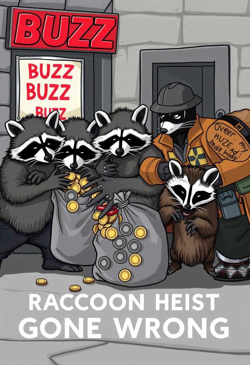 Raccoon Heist Gone Wrong – A group of raccoons in ski masks attempt to rob a "BUZZ Vault." One raccoon is frantically stuffing BUZZ coins into a trash bag, while another is wrestling with a possum security guard who is hissing, "Over my dead body!"