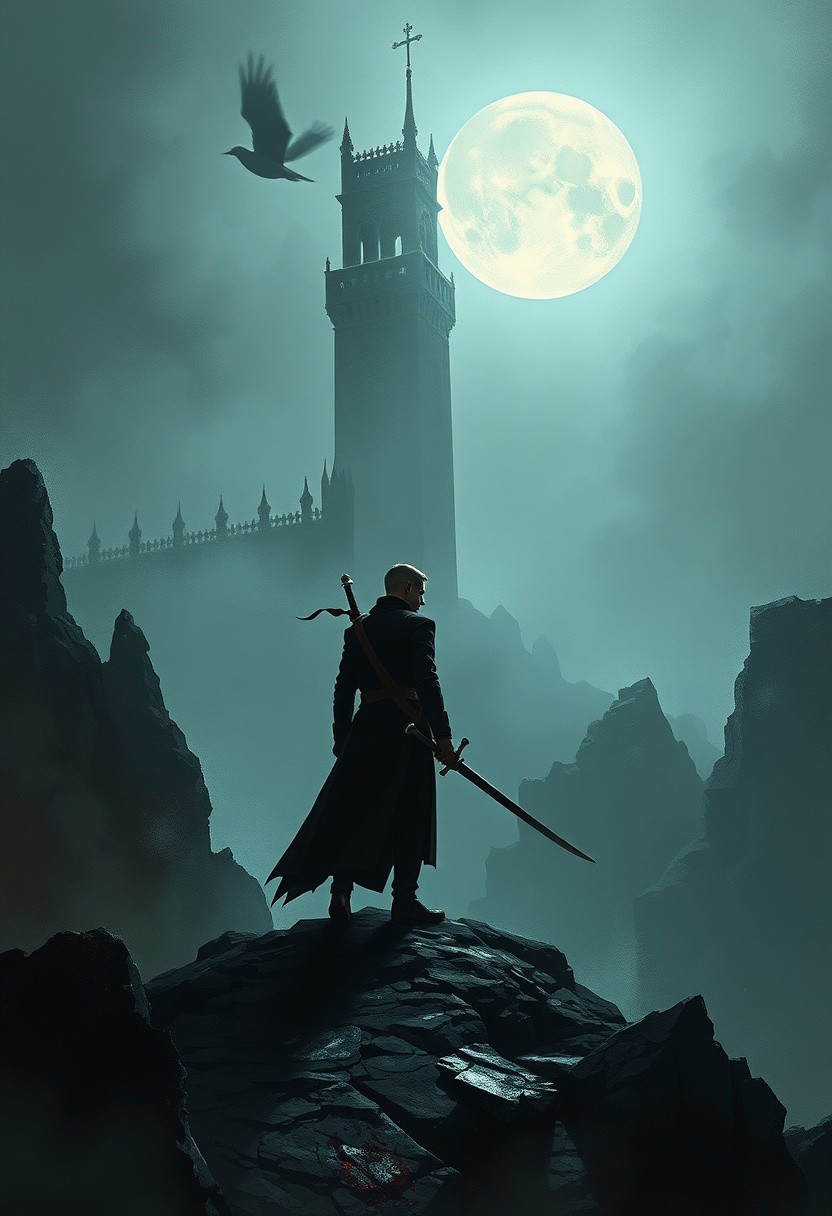 lone hero, gothic tower, full moon, dark fantasy, dramatic lighting, misty atmosphere, stylized character design, long coat, curved sword, rocky terrain, epic scale, cinematic perspective, eerie ambiance, fantasy architecture, brooding mood, surreal stillness meets expressive atmosphere, precise and motionless figures in dramatic textured landscapes, dreamlike lighting with brooding stormy brushstrokes, muted yet moody color palette, architectural clarity dissolving into painterly abstraction