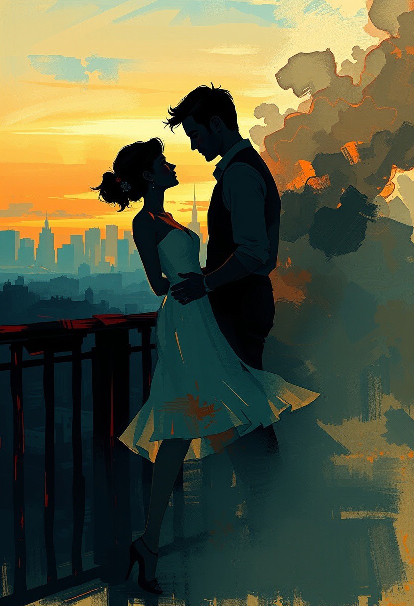 A couple shares a quiet moment on a balcony at dusk, her figure luminous, his silhouette dissolving into painterly streaks of smoke and shadow., cinematic romanticism, expressive abstraction, sensual brushwork, dramatic lighting, stylized figures, emotional realism, contemporary impressionism, vintage fashion, abstract backgrounds, rich color palette, poised movement, painterly energy, narrative tension, soft and bold contrasts, romantic elegance, visual emotion, textural expression, intimate storytelling, modern figurative art, layered atmosphere