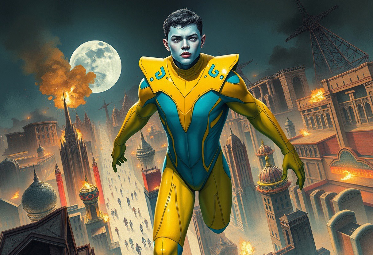 1boy, blue skinned, aged 30 (full body, facing camera, from below). Futuristic fashion, a golden yellow and teal high tech bodysuit , it is form fitting with an open face design. the man has pale blue skin and is muscular and has an athletic form , the hero is flying above a futuristic alien city that is very idyllic and made of numerous organic shaped buildings , Charcoal and colourful oil pastels. impressionistic bidimensional, standing on a rooftop looking down at a city under siege, fires, gunfights, people running. Parts of the city are on fire night time. Fires illuminate dark parts of the city. A building explodes in the background. Broken moon in the night sky. faded watercolours Klimt dadaistic collage by Bill Sienkiewicz, strikingly alluring face. brilliant spotlight effect. Vibrant thick dripping paint. Intense detail, realistic, dynamic shadows and contrasts. Deep rich colours contrast against the dull muted background.