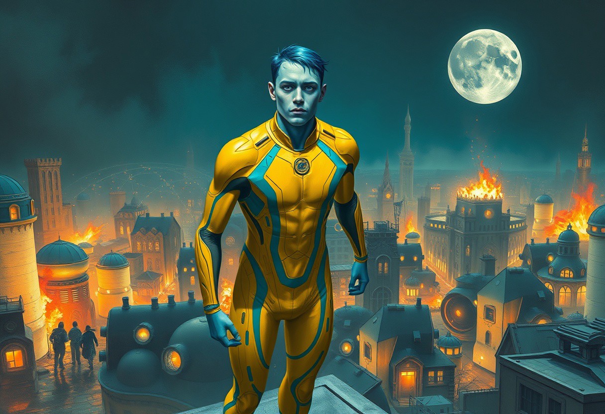 1boy, blue skinned, aged 30 (full body, facing camera, from below). Futuristic fashion, a golden yellow and teal high tech bodysuit , it is form fitting with an open face design. the man has pale blue skin and is muscular and has an athletic form , the hero is flying above a futuristic alien city that is very idyllic and made of numerous organic shaped buildings , Charcoal and colourful oil pastels. impressionistic bidimensional, standing on a rooftop looking down at a city under siege, fires, gunfights, people running. Parts of the city are on fire night time. Fires illuminate dark parts of the city. A building explodes in the background. Broken moon in the night sky. faded watercolours Klimt dadaistic collage by Bill Sienkiewicz, strikingly alluring face. brilliant spotlight effect. Vibrant thick dripping paint. Intense detail, realistic, dynamic shadows and contrasts. Deep rich colours contrast against the dull muted background.
