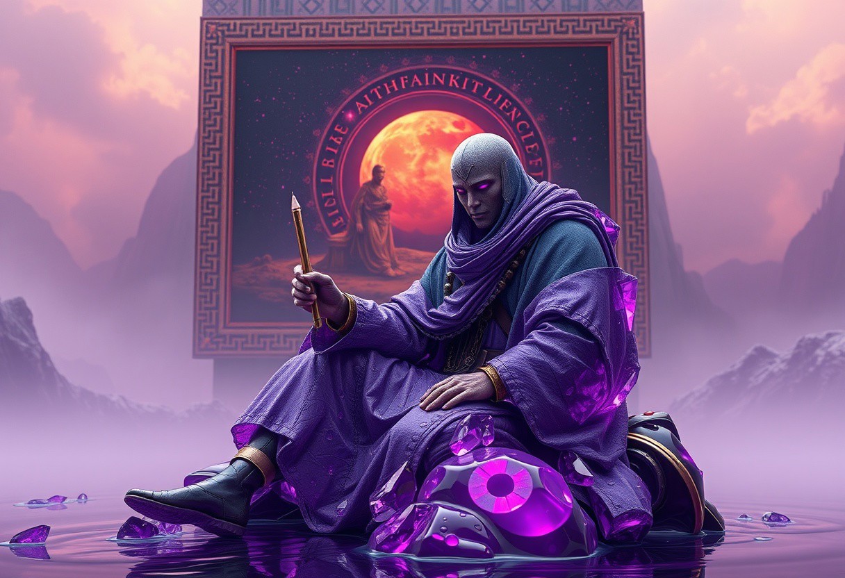 Create a highly detailed, lifelike image of an ancient soldier sitting on top of a Dark City made of liquid purple metal, with a painting of c-3p0 in the background. The soldier should be draped in transparent crystals, christalized, and highly capsuled, with a pencil in hand. Inspired by Sengai, the image should have a rich color palette, a golden ratio composition, and incorporate subsurface scattering and caustics. The style should be reminiscent of Artgerm and trending on Artstation, with an opalescent and particulate quality. Apply a VHS filter and ensure the image has micro details, is in 4k or 8k resolution, and has a safe-for-work (sfw) rating. Render using Octane render for optimal quality.