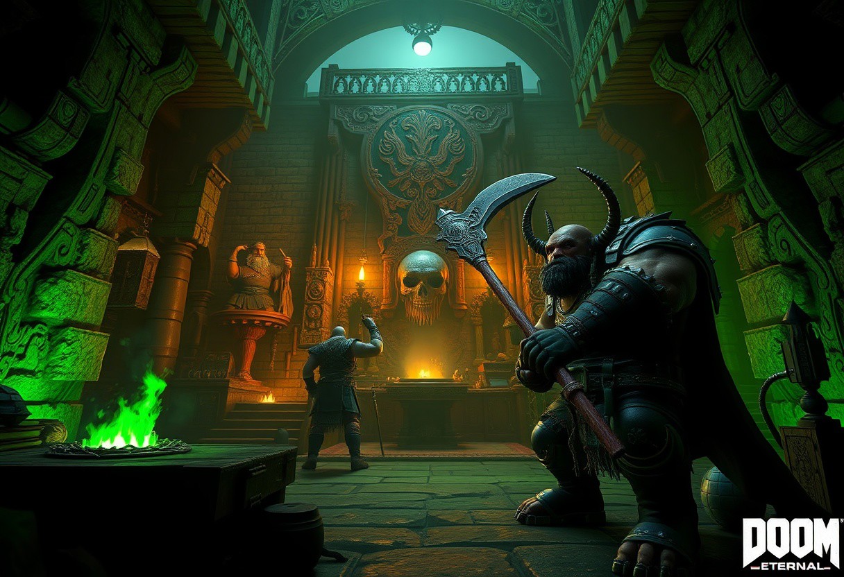 Create a highly detailed, 8K resolution image of a in a Castle of Chaos background, inspired by the Ork theme and Black Thor character from the Doom Eternal art style. The image should be rendered in 3D using Unreal Engine 5, with a focus on photorealism and cinematic quality. The scene should feature a blacksmith, dwarves, and strong walls, with a Skull-Mark Ladybug and an Ork wielding an axe. The atmosphere should be very dark with green lighting, and the image should be composed according to the golden ratio. The final output should be of ultra-high quality, with micro details and lifelike textures, suitable for showcasing on Artstation.