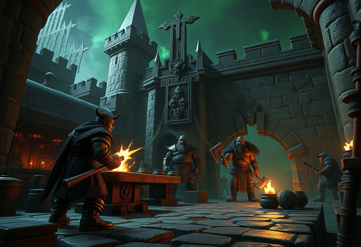 Create a highly detailed, 8K resolution image of a in a Castle of Chaos background, inspired by the Ork theme and Black Thor character from the Doom Eternal art style. The image should be rendered in 3D using Unreal Engine 5, with a focus on photorealism and cinematic quality. The scene should feature a blacksmith, dwarves, and strong walls, with a Skull-Mark Ladybug and an Ork wielding an axe. The atmosphere should be very dark with green lighting, and the image should be composed according to the golden ratio. The final output should be of ultra-high quality, with micro details and lifelike textures, suitable for showcasing on Artstation.