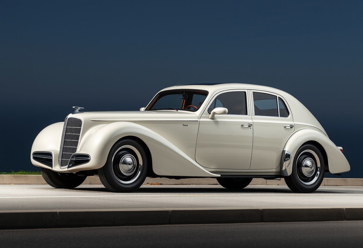 Luxury, elegant four-door sedan car with smooth lines, large wheels, distinctive front grille, and sleek retrofuturistic body design in side view, elongated body profile, prominent wheel arches in the style of the 30s of the 20th century, аrched roof line. On the French riviera.