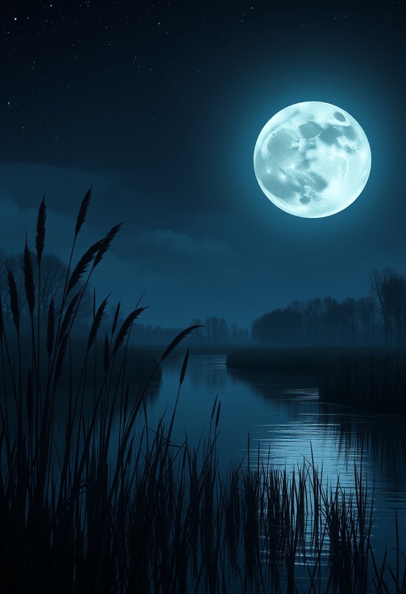 giant full moon, moonlit river, night landscape, tall reeds, reflective water, starry sky, serene atmosphere, glowing moonlight, natural scenery, tranquil setting, dreamy night, hyper-realistic style, peaceful outdoor scene, moon reflection, dark blue tones, emotive storytelling, secrets of time, emotional intensity, warped perception, ethereal atmosphere, intricate textures, interplay of light and shadow, connection amidst constraints, elegantly dressed models,Captivating beauty