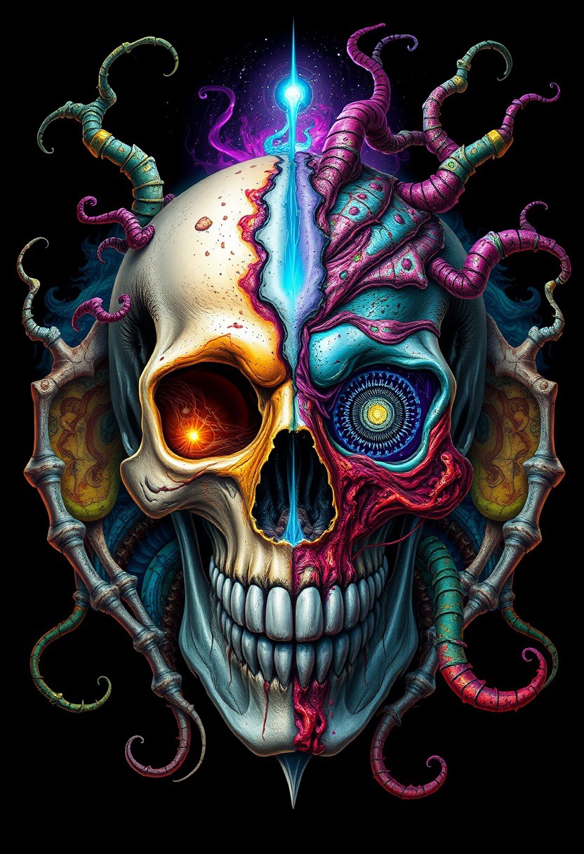 split skull, surreal art, half white bone, half decaying colorful flesh, psychedelic colors, dark background, horror and beauty, glowing eyes, cosmic tendrils, melting textures, duality of life and death, surreal horror illustration, intricate details, vivid contrasts, robot, highly detailed, dreamy, emotive storytelling, nature-inspired sculptures, delicately carved details, divine, luxurious depth, weathered traveler, reflective portal