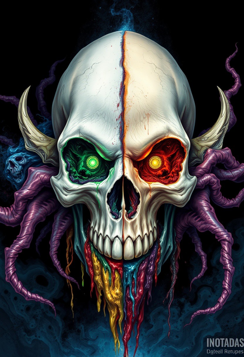 split skull, surreal art, half white bone, half decaying colorful flesh, psychedelic colors, dark background, horror and beauty, glowing eyes, cosmic tendrils, melting textures, duality of life and death, surreal horror illustration, intricate details, vivid contrasts, fantasy art, science fiction, hyper-detailed characters, dynamic compositions, dramatic lighting, powerful figures, warriors, sorcerers, mythical creatures, high realism, vibrant colors, intricate textures, atmospheric effects, energy, epic storytelling.
