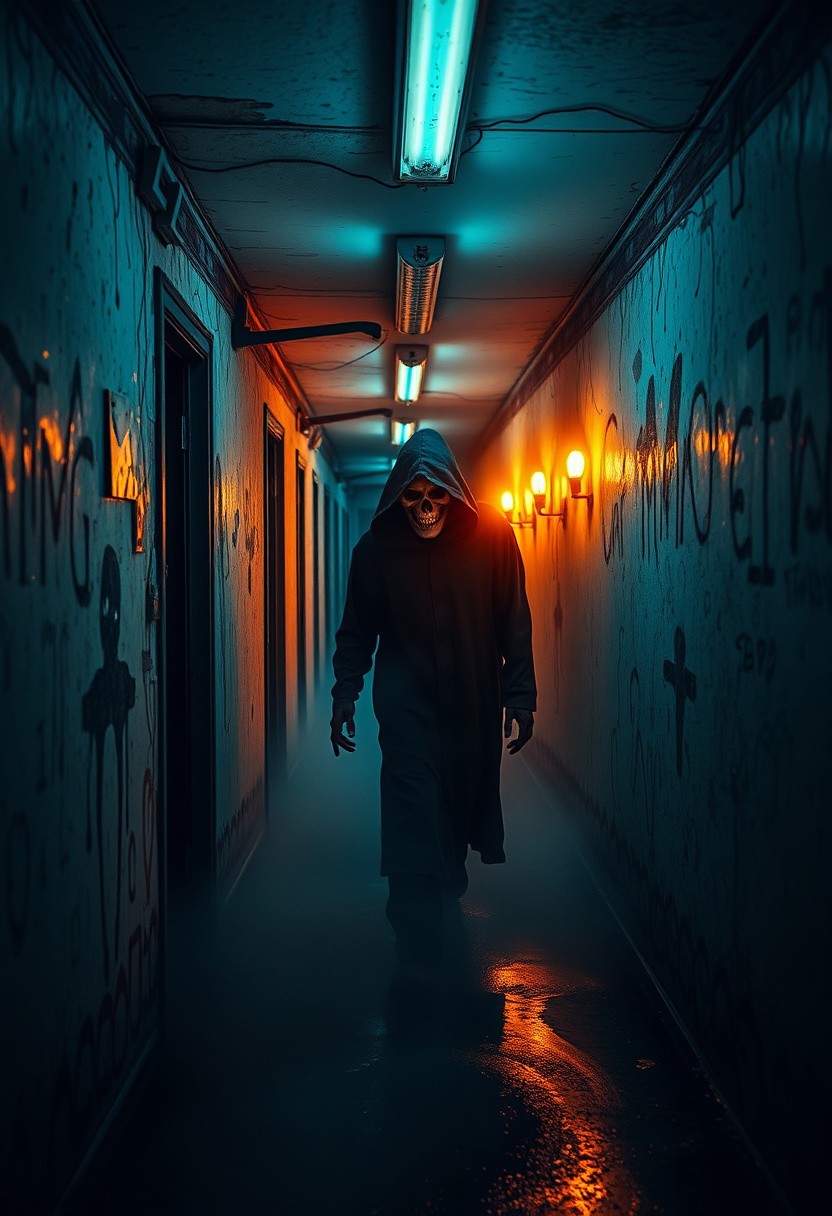 haunted hallway, decaying asylum, eerie blue lighting, ghostly figure, hooded reaper, skeletal face, flickering fluorescent lights, misty floor, horror atmosphere, abandoned building, water reflections, supernatural presence, cinematic horror scene, dark and gritty setting, Mesmerizing distortion, mist rising, digital lighting, luminous textures,splash of paint, visual storytelling, golden hour essence, historical depth, mesmerizing interplay, intricate details
