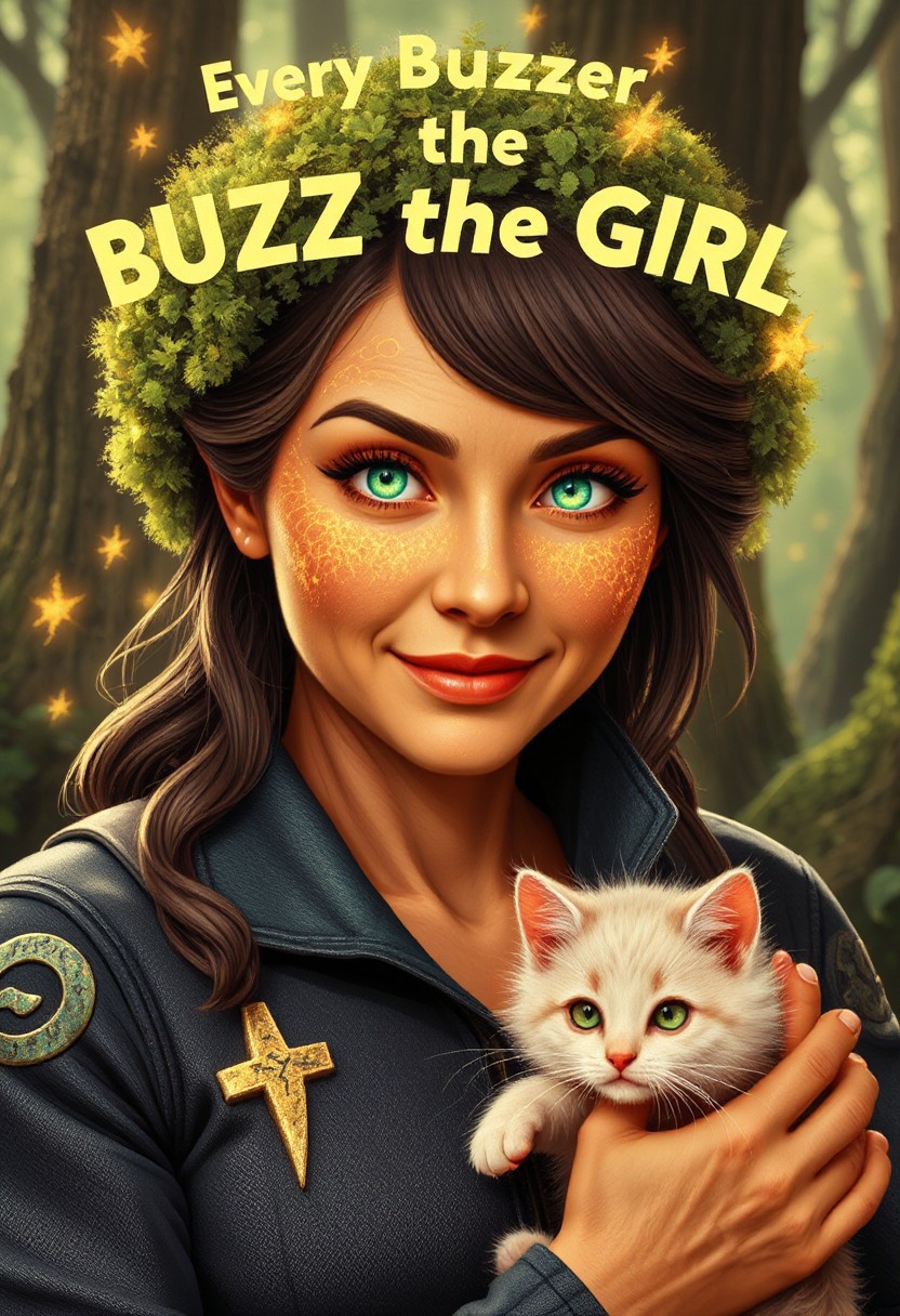 A real middle-age mossy heroine, her every detail crackles with power and purpose: a woman with moss, mossy grass-charged eyes and hair. She has stylized grassy mossy bold symbols on her outfit. The prominent text above her reads "Every Buzzer, BUZZ the GIRL " hinting at her Forest mission. She tenderly cradles a sweet, fluffy kitten in her arms. This vibrant and captivating image, a digital painting, radiates warmth and compassion, drawing viewers into a world where bravery and kindness reign supreme.