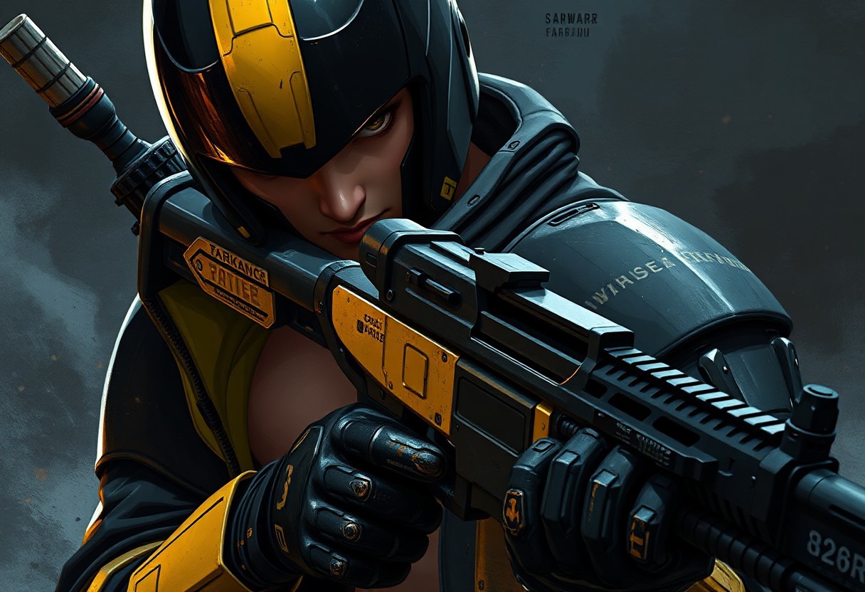 Create a close-up illustration of a warrior with a gun, featuring a black armor exoskeleton with yellow accents, inspired by tokusatsu and the art style of Peter Bagge. The character should have a faceless horror human design. The artwork should incorporate a stardust gradient scheme and a black scheme, with a cool jacket over a bare torso. The desired level of detail is high, with micro details, lifelike details, and adherence to the golden ratio. The image should be rendered in 4k, with a 35mm lens, and a noir-inspired aesthetic. The final output should be a hyperrealistic digital painting, with post-processing and octane render. The style should be reminiscent of Andrew Wyeth's concept art, with a focus on charism and beauty. The image should be suitable for display on Amiami and Artstation, with a trending and high-quality aesthetic.