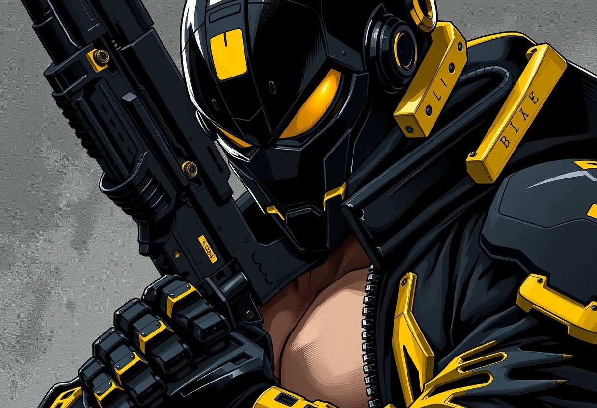 Create a close-up illustration of a warrior with a gun, featuring a black armor exoskeleton with yellow accents, inspired by tokusatsu and the art style of Peter Bagge. The character should have a faceless horror human design. The artwork should incorporate a stardust gradient scheme and a black scheme, with a cool jacket over a bare torso. The desired level of detail is high, with micro details, lifelike details, and adherence to the golden ratio. The image should be rendered in 4k, with a 35mm lens, and a noir-inspired aesthetic. The final output should be a hyperrealistic digital painting, with post-processing and octane render. The style should be reminiscent of Andrew Wyeth's concept art, with a focus on charism and beauty. The image should be suitable for display on Amiami and Artstation, with a trending and high-quality aesthetic.