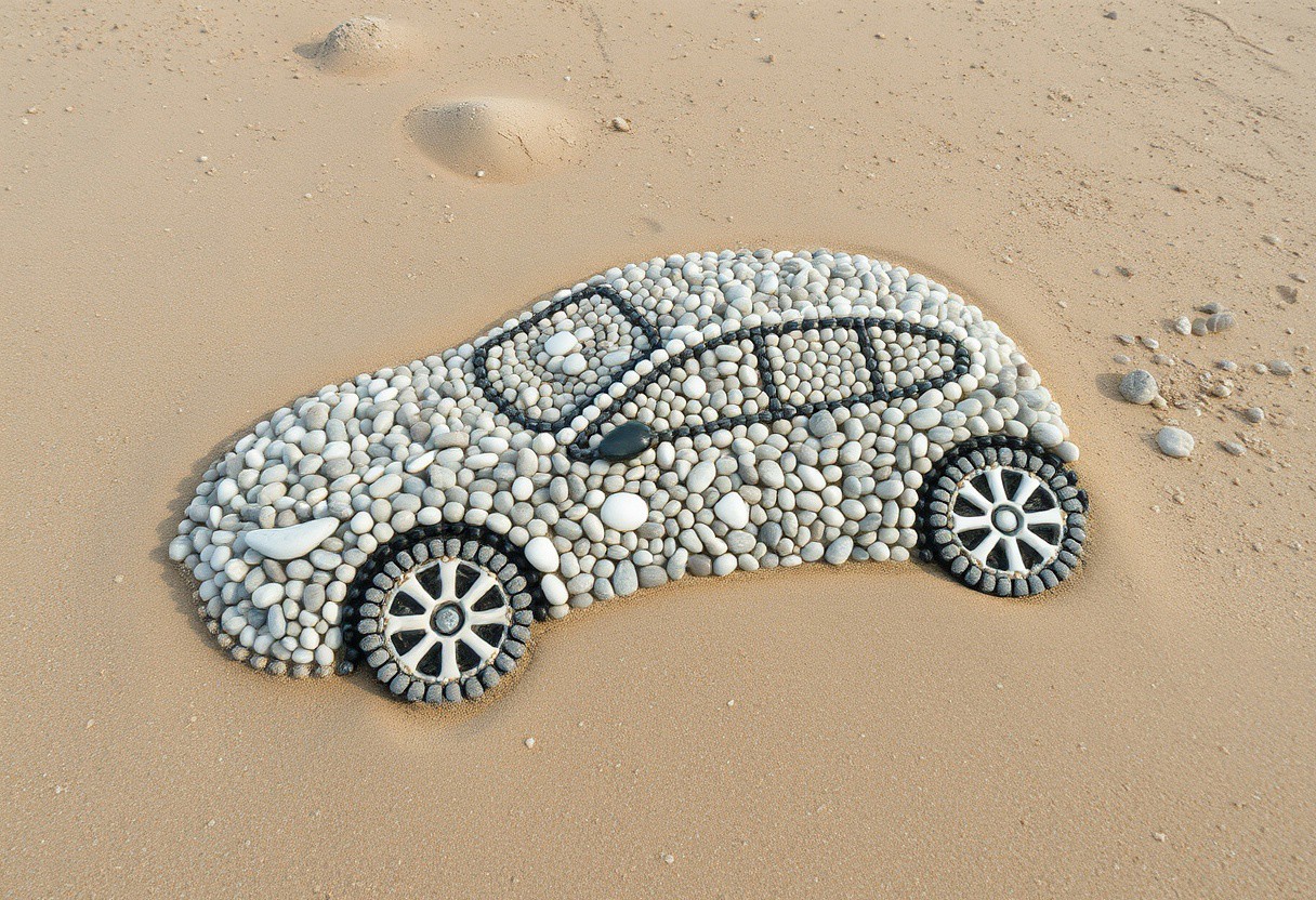 Pebble art mode, a car made from intricate pebble patterns depicted on the sandy beach