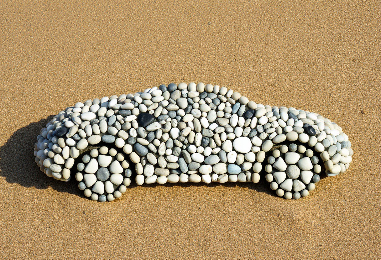 Pebble art mode, a car made from intricate pebble patterns depicted on the sandy beach