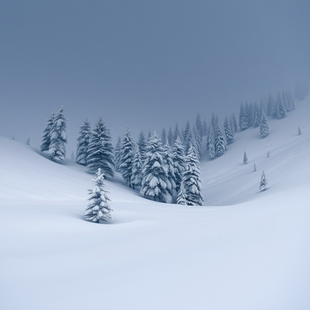 Snowy Hills, Pines Trees, Heavy Snowfall, Nighttime