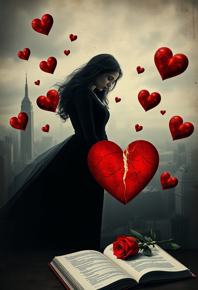 surreal emotional scene, woman in black, cracked red heart, floating hearts, grayscale cityscape, symbolic love and sorrow, open book and rose, selective red color, moody atmosphere, introspective tone, surreal background, emotional contrast, artistic symbolism, dramatic lighting, mid-century modern surrealism, eerie yet elegant, haunting chiaroscuro lighting, melancholic dreamscape, distressed painterly textures, muted vintage color palette, deep shadows and golden highlights, surreal human-organic fusion