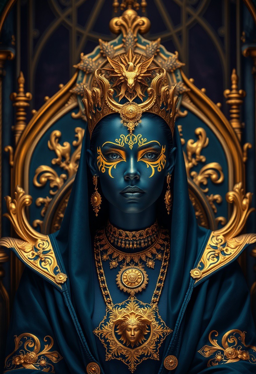 regal figure, dark blue skin, gold facial markings, ornate jewelry, deep teal robe, golden throne, baroque style, celestial motifs, radiant medallion, gothic architecture, fantasy royalty, divine aura, mystical setting, symmetrical composition, dramatic lighting, moment of introspection, enigmatic presence,reflections, cinemascope, tranquil atmosphere, striking saturated hues, dark beauty, bold golden accents,Enchanting realm, and purple