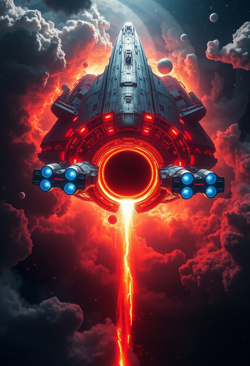 massive starship, glowing black hole, cosmic vortex, blue engine thrusters, interstellar travel, space exploration, futuristic spacecraft, luminous clouds, celestial bodies, dramatic lighting, science fiction, deep space, cosmic wonder, high detail, cinematic style, moody, digital painting, relentless passage of time, fiery reds, boundary of perception, ethereal beauty, reflective brilliance, enhanced textures and contours, otherworldly allure, transparent pathway