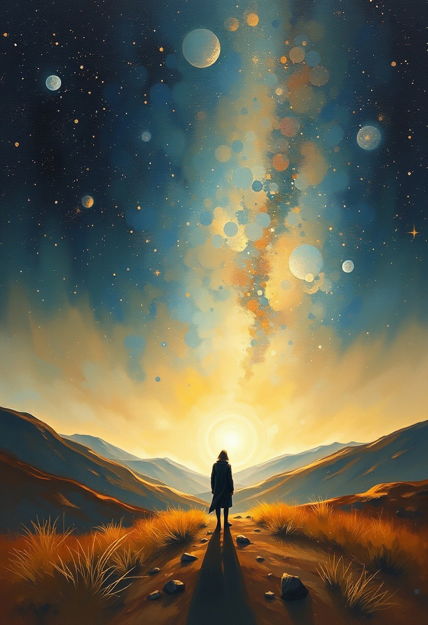 A solitary figure standing against a deep cosmic backdrop, impressionist landscapes, pointillist technique, luminous lighting, soft brushstrokes, rich color harmony, atmospheric depth, plein air painting, naturalistic scenery, delicate textures, dynamic compositions, warm golden tones, vibrant yet subtle contrasts, timeless elegance, painterly realism, serene ambiance