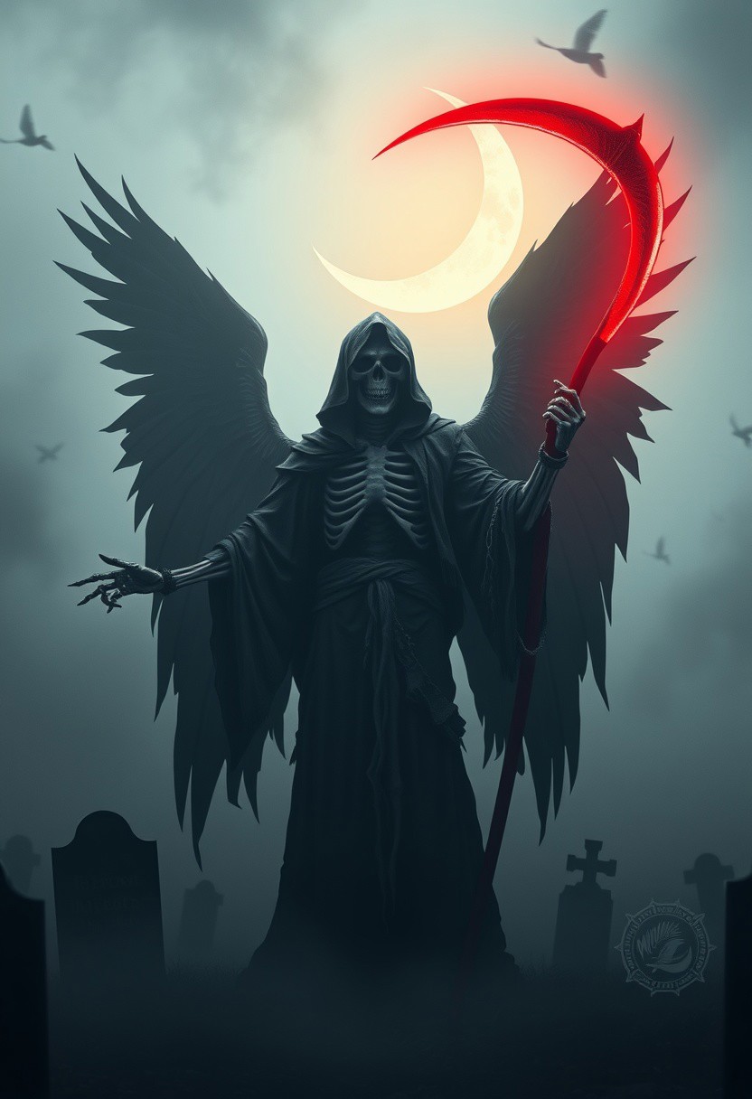 A powerful and eerie depiction of the Grim Reaper stands in the center of a fog-shrouded graveyard, silhouetted by a glowing crescent moon. The skeletal figure is cloaked in a tattered black robe and towers ominously with outstretched, bony fingers. Massive, dark wings spread behind it like those of a fallen angel, giving the figure an even more menacing and supernatural presence. The scythe in its right hand glows with a fiery red edge, adding a sharp contrast to the muted, misty atmosphere. Gravestones fade into the background fog, reinforcing the theme of death and the afterlife in this haunting and cinematic composition.