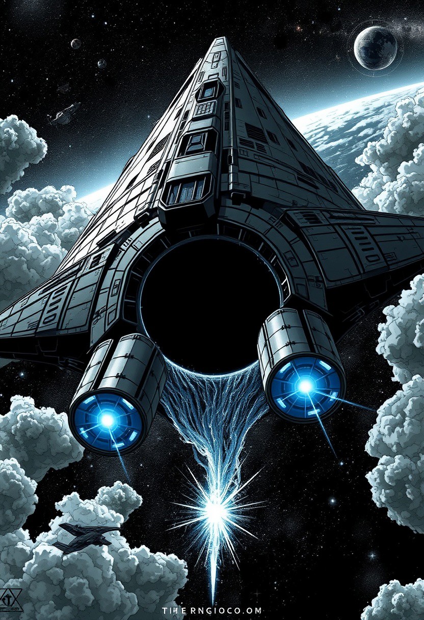 massive starship, glowing black hole, cosmic vortex, blue engine thrusters, interstellar travel, space exploration, futuristic spacecraft, luminous clouds, celestial bodies, dramatic lighting, science fiction, deep space, cosmic wonder, high detail, cinematic style, dark, graphic, meticulous detail, stark black-and-white, high-contrast, bold aesthetic, classic comic book influence, alienation themes, body horror, surreal elements, realistic figures, grotesque imagery, clean linework, dramatic shading, eerie tone
