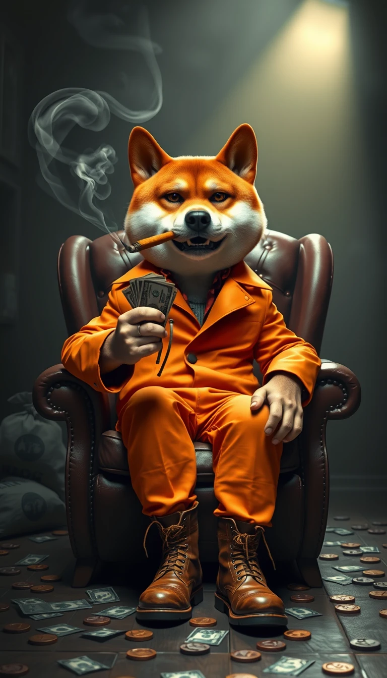 A striking and intense image of a Shiba sitting in a leather armchair. Confidently, in the style of a ruthless loan shark and mafia boss. He is dressed in a stylish orange jumpsuit, with a bold orange jacket adding a surreal yet darkly comic touch. He wears brown fashion boots. He stands in command, with one hand holding a thick, smoking cigar, in the other holding a stack of dollars tightly. His expression is fierce, with furrowed brows and a piercing gaze that exudes menace and power. The background is a dark, poorly lit space with subtle details and a dim beam of light, faint silhouettes of bags of money, with the "DOG Coin" logo, lots dollars and coins scattered on the floor, creating an atmosphere of danger and underhanded business. Smoky tendrils of the cigar swirl in the darkened environment, adding depth and drama to the scene. Disney Pixar movie style.