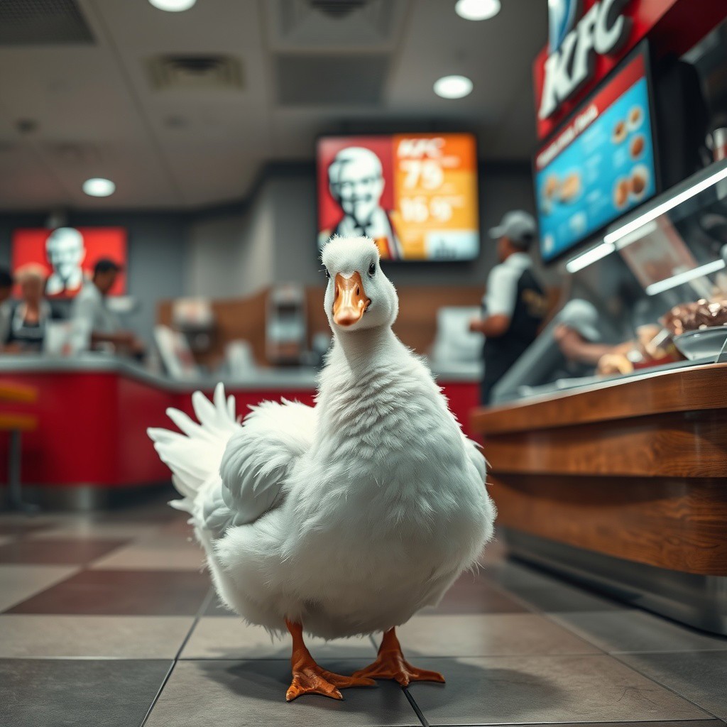 anatomically correct, (hyper realistic, ultra detailed), complex shadows, intricate details, white duck, animal focus, black eyes, fluffy, short, standing, restaurant, KFC, white duck is on the floor, white duck is in front of cashier counter, white duck is looking at the tv display menu, the cashier is confused as to see a white duck, kitchen staff are visible in shot, full shot,
