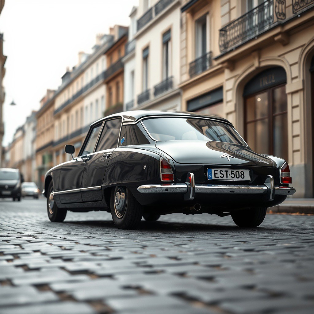 Photorealistic image of a classic Citroen DS21 in black color, parked on a characteristic Parisian street. The car is positioned at a three-quarter rear low angle. The scene is illuminated by soft, diffused light on a cloudy day. The background features typical Parisian architecture, cobblestone streets, and subtle reflections on the car's glossy surface. High detail, ultra-realistic textures, cinematic lighting